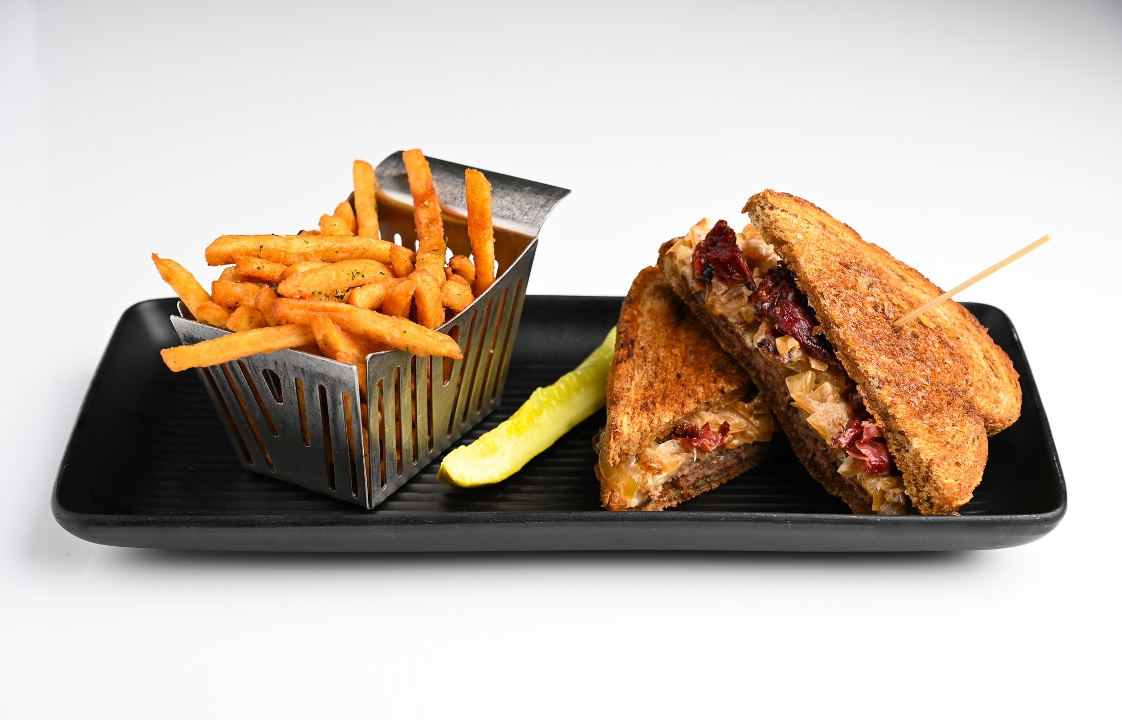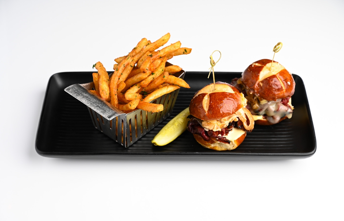 double smash patties topped with pastrami, melted Gruyére, sautéed onions, & Tap Sauce on marbled rye. served with fries.