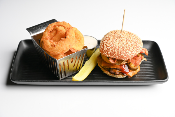 double smash patties, bacon, caramelized onions, American cheese, shredded lettuce, & our Signature Tap Sauce on a buttered & toasted seeded bun.