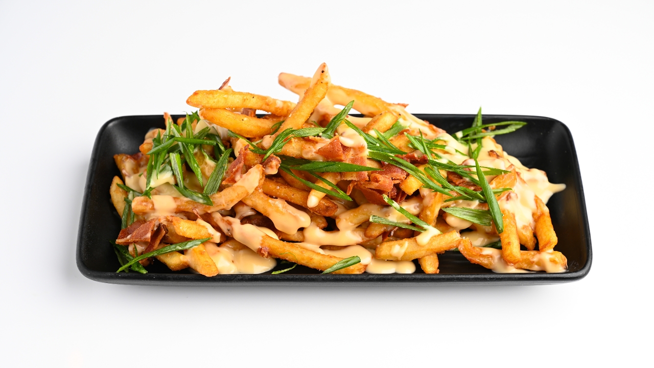 french fries, Monterey Jack cheese sauce, chopped bacon & scallions